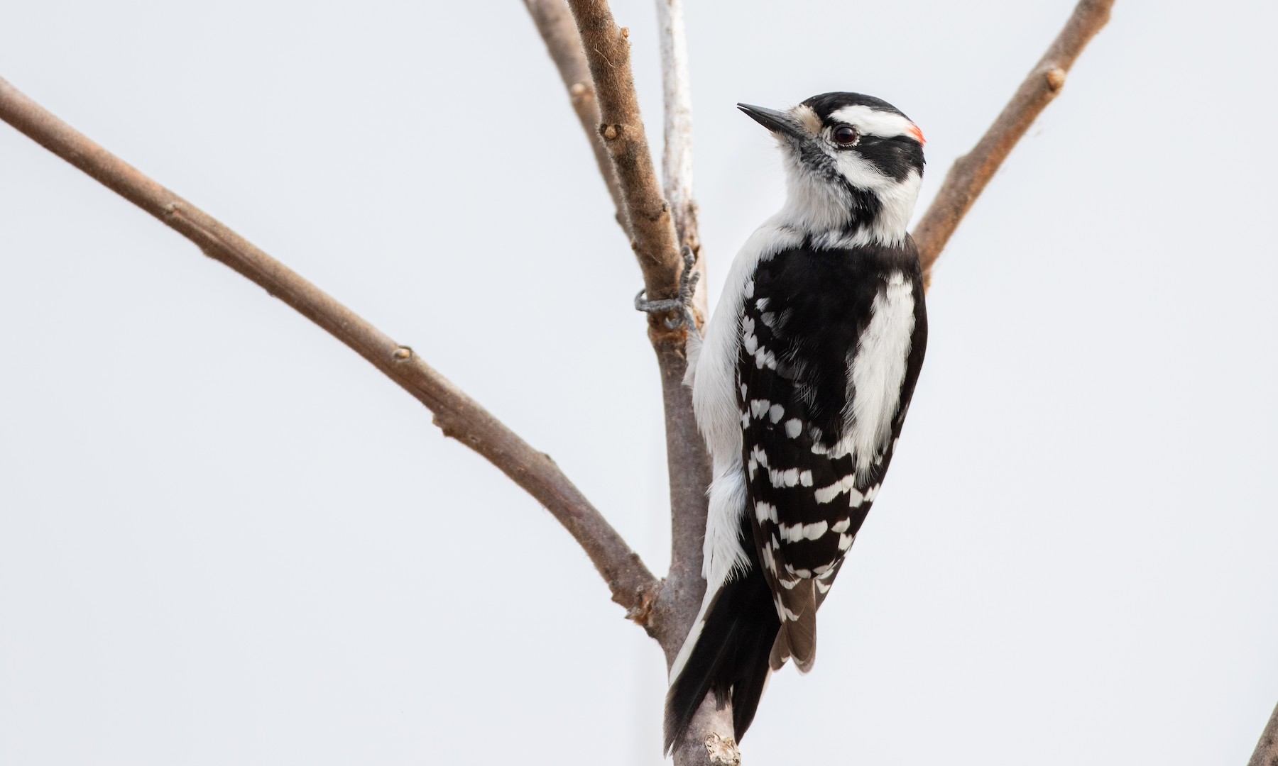 The active little downy woodpecker is a familiar sight at backyard feeders and in parks and woodlots, where it joins flocks of chickadees and nuthatches, barely outsizing them.